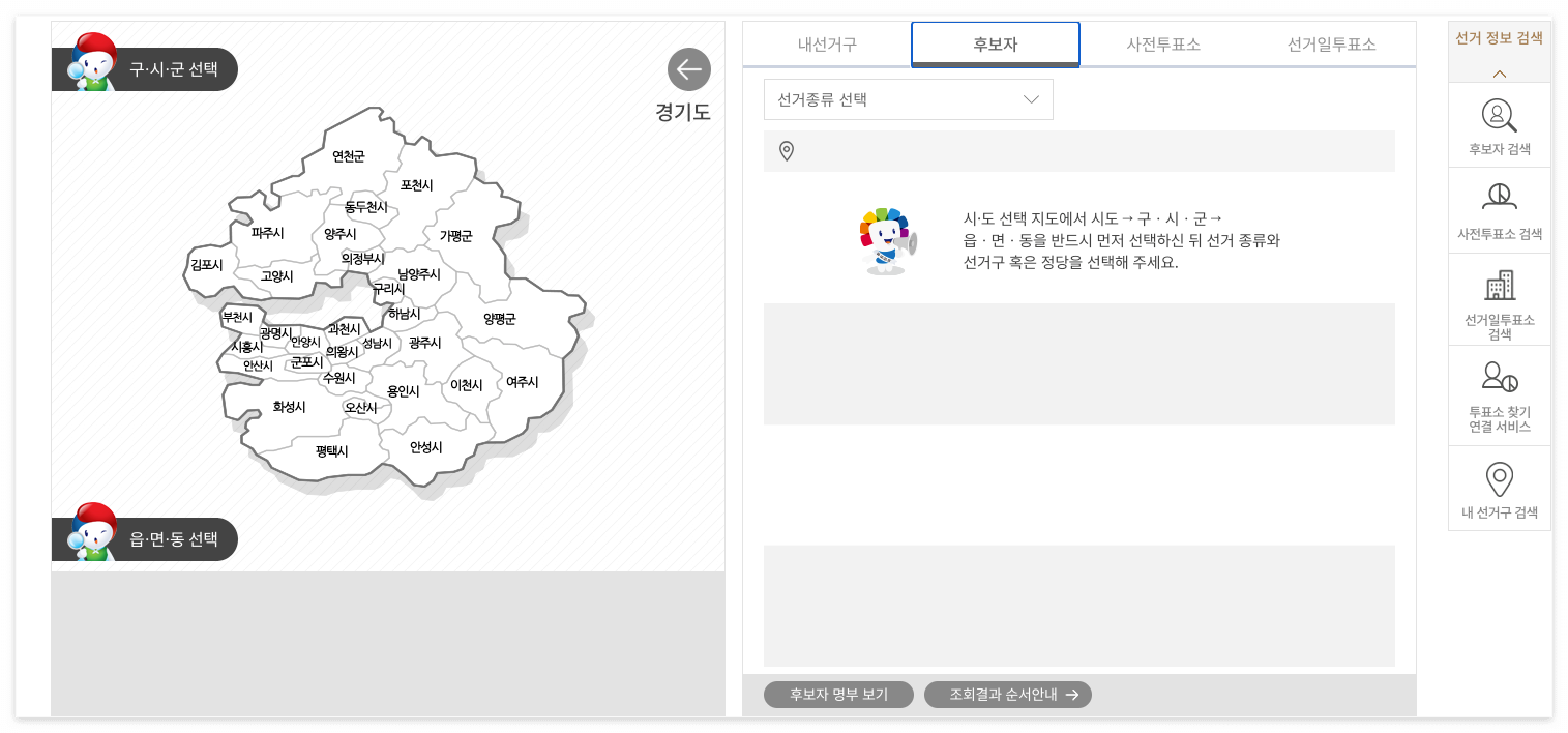 - 보고싶은 후보들의 상세정보를 클릭하면 후보자의 기본정도, 재산, 병역, 납세, 전과, 학력, 공직선거경력 등을 한눈에 볼 수 있습니다.