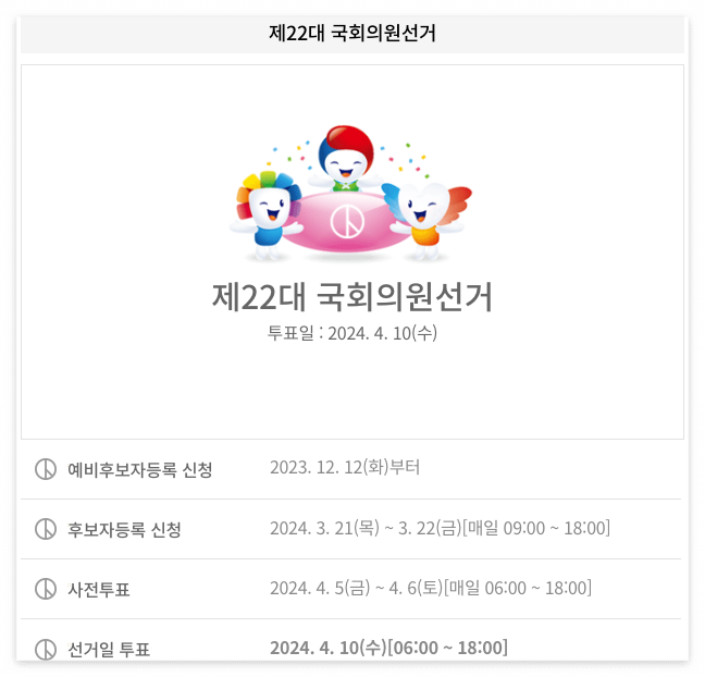- 사전투표일 : 2024년 4월 5일 금요일~4월 6일 토요일