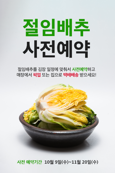 드디어 시작된 절임배추 사전예약 기간! 저희집도 11월 초에 사전예약 기간에 절임배추를 구매하기로 했는데요~오늘은 유명한 대형마트인 이마트 절임배추 사전예약, 홈플러스 절임배추 사전예약, 롯데마트 절임배추 사전예약 방법에 대해 자세히 알아보도록 하겠습니다!