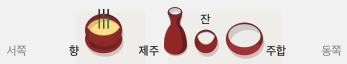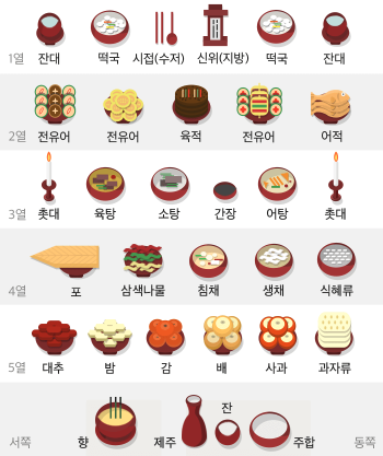 | 5열 | 조율이시 (왼쪽부터 대추, 밤, 감) / 홍동백서 (붉은 과실은 동, 흰 과실은 서쪽) |